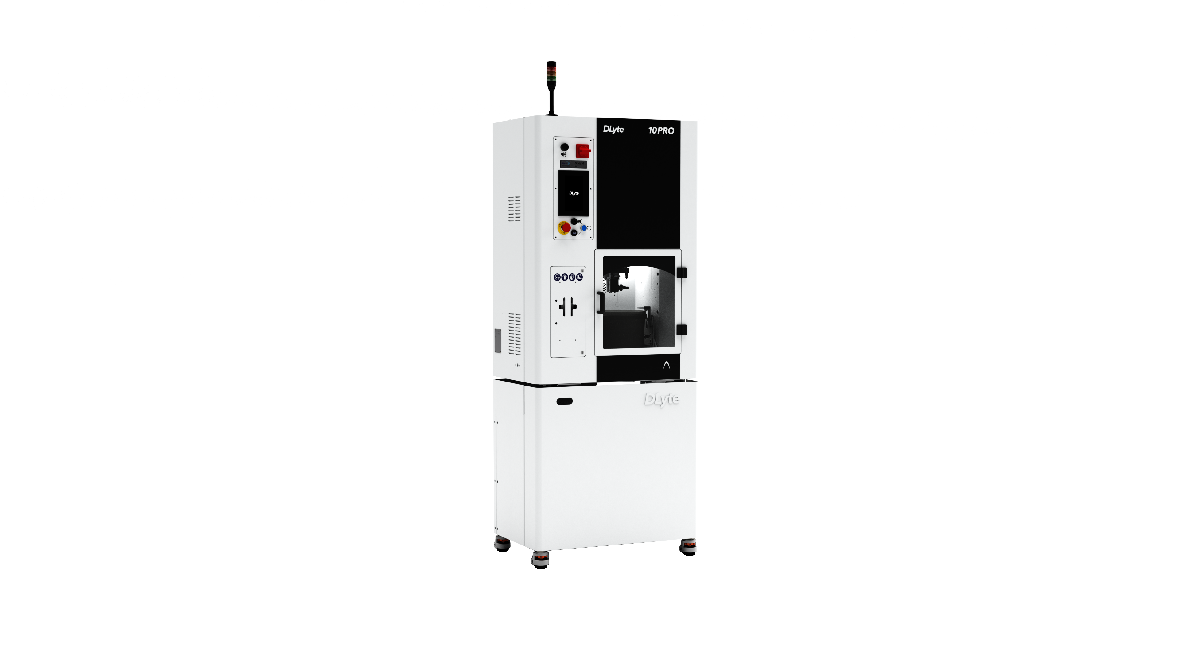 The hardware is designed with robust and reliable mechanics to work continuously in mass production. It allows to have an easier access for maintenance and operation. Its new safety system includes a warning light tower which indicates the machine status, and an external pneumatic stop cock for safe operations.